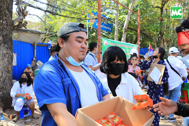 Myanmar Plaza Shopping Center အရှေ့မှာ ဆန္ဒပြနေတဲ့ ပြည်သူများကို ရေသန့်ဗူး နှင့် မုန့် များ